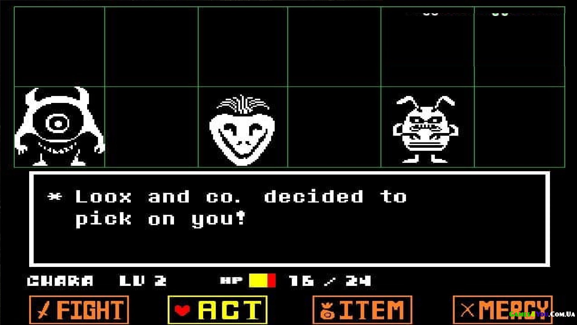 На перших хвилинах геймплей виглядає класичним для покрокових RPG з Японії - безмовний герой гуляє казковими локаціями, проводить діалоги з іншими персонажами і часом потрапляє в битви. Тут і виявляються відмінності. У грі Undertale зовсім не обов'язково вбивати всіх, навпаки, миролюбне рішення сутички нагороджується. Для цього є багато методів, від простої розмови та дружнього обіймання, до втечі з поля битви та угоди на нічию.