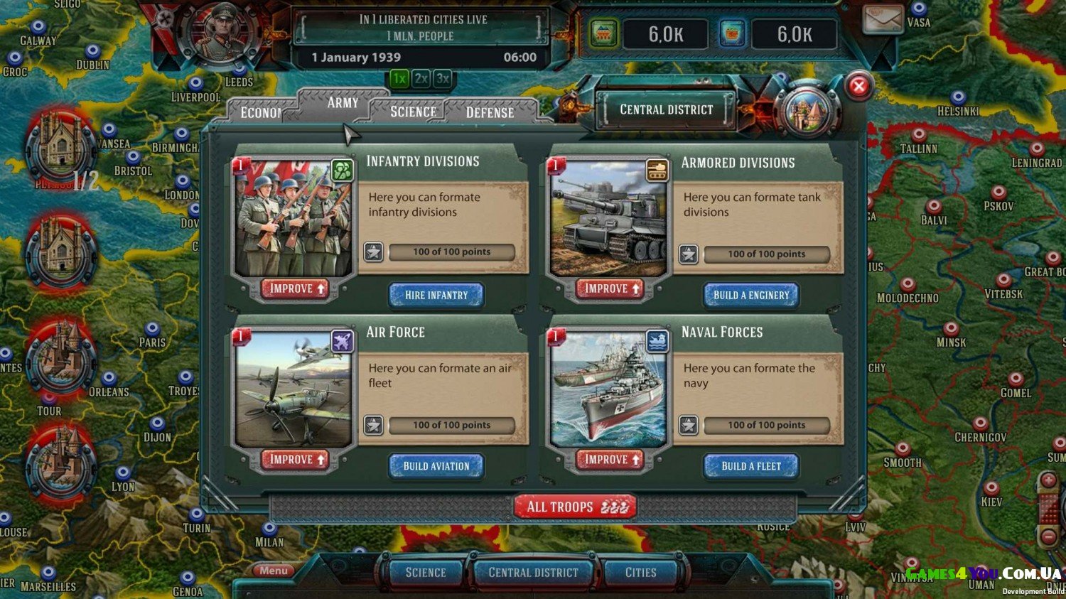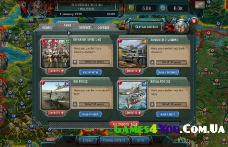 Тепер залишилося лише вибрати бік конфлікту: СРСР, Німеччина чи Союзники. Управлятиме вас військами, які будуть переміщатися світовою картою і виконувати беззаперечно ваші накази. Прийде продумувати тактичні маневри і намагатися вибудовувати стратегічні плани. Цікавою стороною стане розвиток та покращення, на які обов'язково варто звертати увагу.