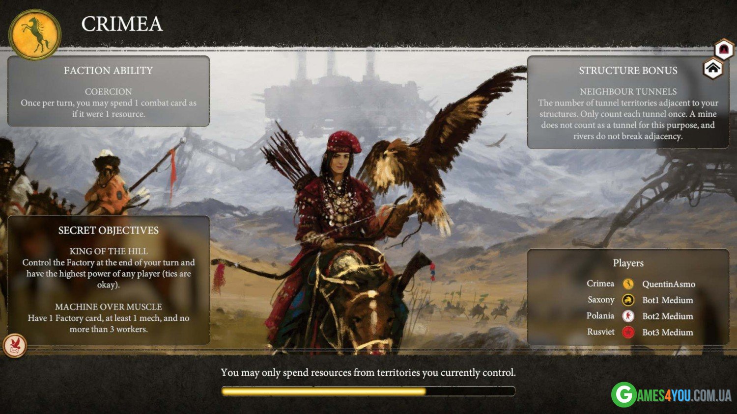 Все, що вам потрібно, уважно стежити за розвитком своєї держави, захищати кордони та прагнути відкрити технологію механічного конструювання. Тільки не слід поспішати, адже у грі буде чимало ворогів, і щоб упоратися з ними, доведеться докласти чимало зусиль. Кожна держава суперник має особисту унікальну тактику, має безліч різноманітних переваг і точно не дозволить вам спочивати на лаврах. Настав час довести світові свою перевагу, дати відсіч загарбникам і особисто захопити нові землі. Бажаємо вам удачі та всього найкращого!