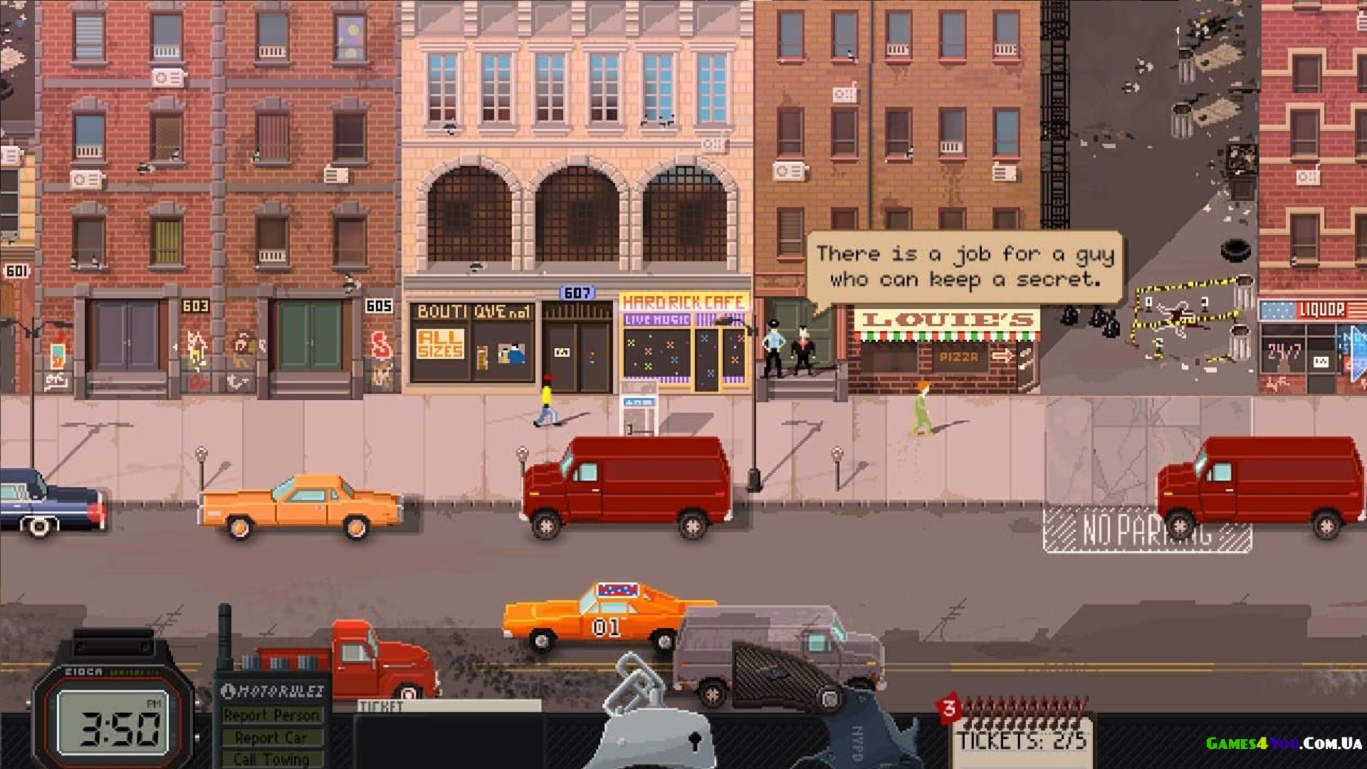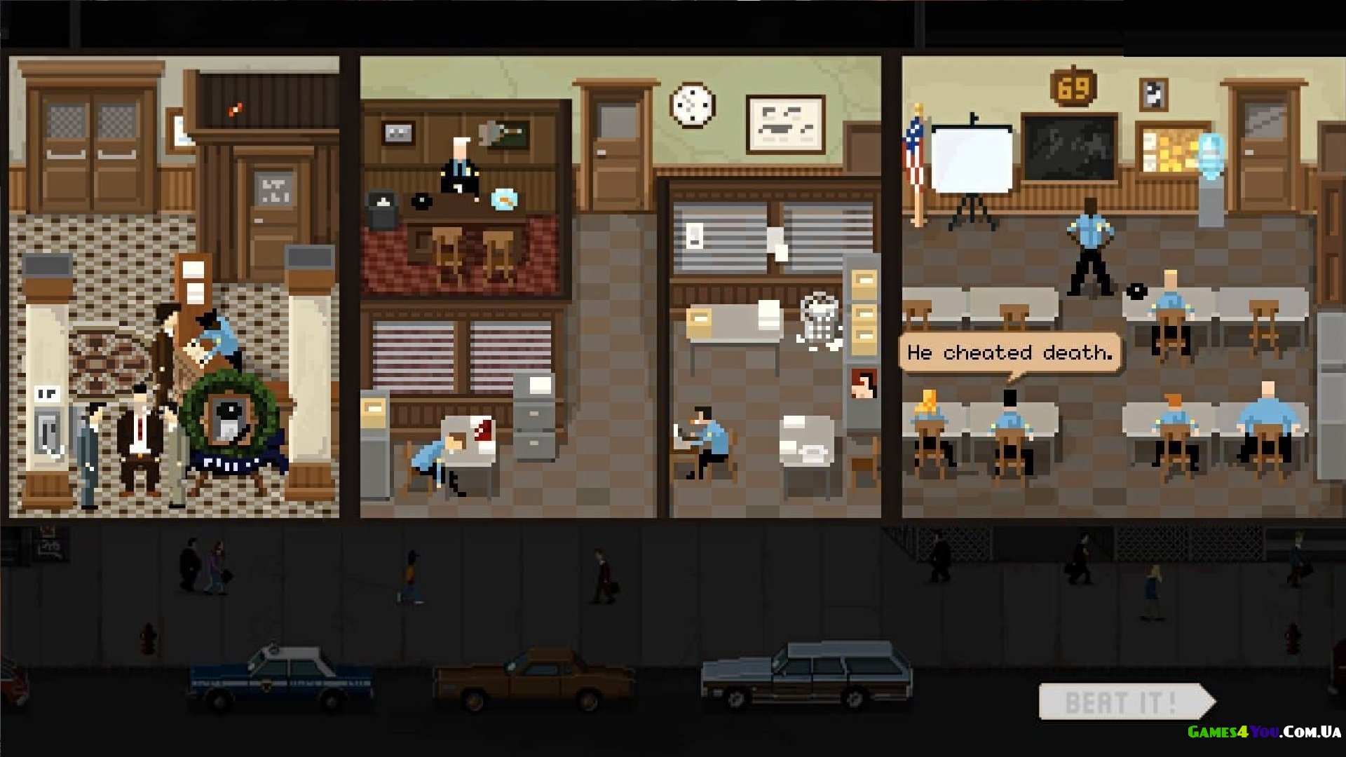 Гра представлена у форматі піксельної пригоди, в ній можна використовувати озброєння, намагатися маніпулювати інформацією і часом влаштовувати справжнісінький хаос. Beat Cop - це гра для тих, хто хоче зняти стрес, постаратися вирватися з рутиного життя і нарешті проявити себе. А ми бажаємо вам успіху та пропонуємо завантажити Beat Cop через торрент безкоштовно, це буде вірним рішенням для початку своєї кар'єри.
